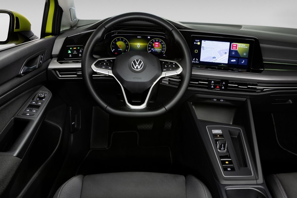 Ook wat interieurruimte betreft is de Golf daarmee niet noemenswaardig veranderd, maar toch is het interieur de plek waar de revolutie plaatsvindt. De strakke opzet blijft behouden, maar van de wat traditionele insteek van voorgaande Golfs is weinig over. Standaard krijgt de Golf een 10,25-inch metend digitaal instrumentarium en een centraal geplaatst 8,25-inch scherm mee. Wie een van de optionele 10-inch-systemen bestelt, wordt getrakteerd op wat Volkswagen ‘Innovision Cockpit’ noemt. Dat betekent dat de schermen net als bij Mercedes optisch worden samengesmolten, wat voor een high-tech-uitstraling moet zorgen.