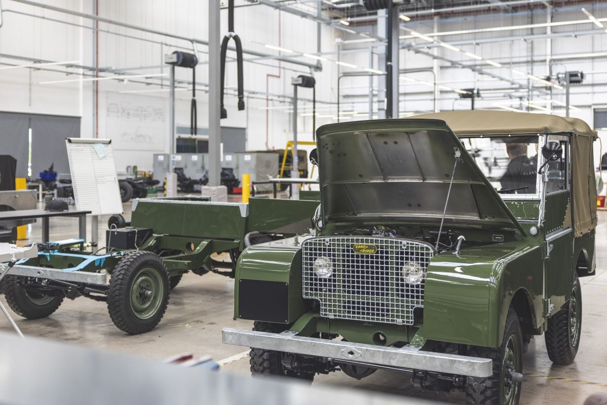 Een naar (beter dan) nieuwstaat teruggebrachte Land Rover Series 1, met daarnaast het chassis van eentje in aanbouw.