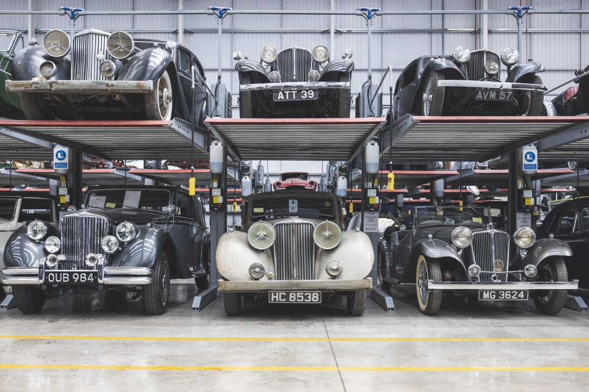 Na afloop was er nog wat tijd over om te kijken hoe een klein half uurtje verderop, bij Classic Works in Coventry, tientallen klassiekers en youngtimers worden onderhouden, gerepareerd of gerestaureerd in een gigantische, 14.000 vierkante meter grote hal met niet minder dan 54 bruggen. We treffen er Jaguars, Land Rovers en Range Rovers van allerlei pluimage aan; van XJ220’s waarvan ‘even’ de twinturbo-V6 wordt gedemonteerd voor een beurtje, tot decennia oude Land Rovers die ogenschijnlijk in staat van ontbinding zijn. Hier worden ze met geduld, kunde (en geld) weer opgelapt. Alsof deze rondleiding nog niet indrukwekkend genoeg is, worden we na afloop nog even mee naar achteren genomen om via een anoniem deurtje te belanden in een ware schatkamer. Hier staan de auto’s rijen dik geparkeerd en tot driehoog opgestapeld, en we komen ogen en tijd te kort om de ruim vierhonderd klassiekers, youngtimers, filmauto’s, concept-cars, one-offs en andere rariteiten in ons op te nemen. We gaan desondanks een poging doen. Geniet mee!