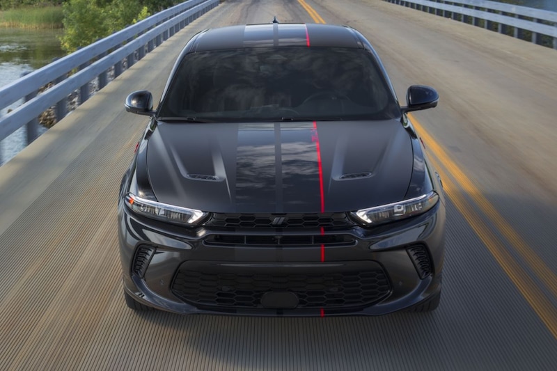 Je hoeft bepaald geen kenner te zijn om aan de Dodge Hornet te zien dat het in feite gewoon een Alfa Romeo Tonale is. Dodge trekt de Alfa-kenmerkende Scudetto-grille van het front en zet er een meer gebruikelijke horizontale gleuf voor in de plaats. Onder het rooster dat zich direct tussen de koplampen bevindt, vinden we een tweede brievenbus in de voor de Hornet aangepaste voorbumper. Lager in de neus zit nog een grote opening met - je raadt het al - aan weerszijden nóg twee openingen.