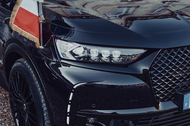 Aan de buitenkant spotten we blauw/rode knipperlichten, vlaggenstokhouders, een speciale antenne en speciale 20-inch wielen. De lak lijkt zwart, maar is diep-donkerblauw. Wel moet ons nog van het hart dat het met de smaak van Macron wel bergafwaarts lijkt te gaan. Waar de eerdere presidentiële DS nog rijkelijk was voorzien van toepasselijk chroom, krijgt de nieuwe louter zwarte accenten en zelfs ook zwarte wielen mee. Het eindresultaat oogt wat ons betreft dan ook eerder als het verzinsel van een leaserijder die liever een Audi had gekozen, dan als een echte presidentiële limousine. Maar wie zijn wij …