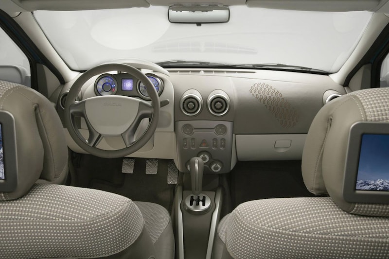 Ook het interieur werd volgeperst met tijdsconforme gimmicks en hebbedingetjes die Dacia in een productiemodel helemaal niet kon leveren. We noemen niet alleen leren bekleding en de volgens Dacia 'hightech-stoffen', maar ook zeker de in de achterzijde van de hoofdsteunen geïntegreerde schermpjes waarop de achterpassagiers dvd's konden kijken. Volgens Dacia waren die schermpjes overigens ideaal voor 'zelf gefilmde freestyle-moves van het laatste snowboardavontuur'. En kijk eens naar die middenconsole? Daarin geen normale autoradio, maar een heuse mp3-speler! Dat past helemaal in het eerste decennium van deze eeuw.