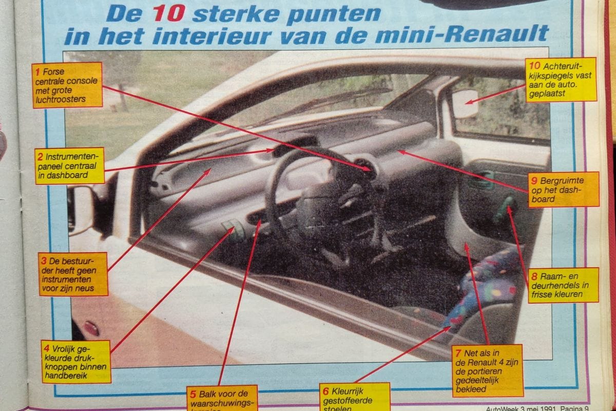 Het totaalplaatje kon toen in ieder geval direct op bewondering rekenen, ook al waren sommige details nog niet helemaal zichtbaar. "De ontwerpers zijn met frisse moed deze nieuwe richting ingeslagen. De kleinste Renault is eenvoudig maar modern, doet sympathiek aan en is beslist aparter dan de Fiat Panda. Hij een toonbeeld van vernieuwing." Dat kon ook gezegd worden over het interieur, dat ook al behoorlijk goed in beeld verscheen. Het opvallendste element vonden we destijds dat er geen klassiek instrumentarium voor het stuurwiel zat. Daarbij werd een leuke vergelijking gemaakt: "De instrumenten zitten in het midden van het dashboard, net zoals in de oude modellen van de Britse Mini. Recht voor de bestuurder zitten de waarschuwingslampjes." Wat we toen nog niet wisten, is dat het centrale instrumentencluster geen analoge klokken kreeg, maar een heus digitaal display zou worden.