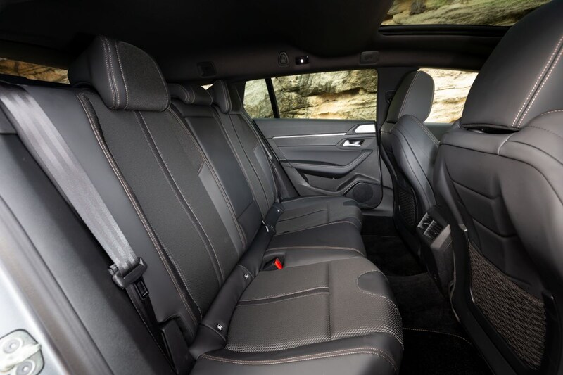 Om met een zes centimeter lager dak toch genoeg hoofdruimte over te houden, heeft Peugeot de zittingen van de stoelen en achterbank iets lager gepositioneerd. Voorin resulteert dit in meer dan genoeg ruimte, zelfs met een lengte van twee meter schuur je nog lang niet met je kruin langs de hemelbekleding. Doordat de daklijn bij de stationcar naar achteren hoog blijft doorlopen, is er voor de achterpassagiers vier centimeter meer hoofdruimte dan in de sedan en dat is best fijn; tot een lengte van pak ‘m beet 1,85 m zul je je hoofd niet stoten. Het idee van de lage achterbank lijkt dan ook best aardig. Maar … je scheenbenen worden niet korter en dat betekent dat je bovenbenen onder een hoek komen te staan en niet of nauwelijks op de (vrij korte) zitting van de achterbank rusten. Je zit als het ware in een hurkhouding met slechts ondersteuning onder de billen. Voor een korte rit is dat wellicht niet zo’n probleem, maar op langere trips wordt dat vermoeiend.
