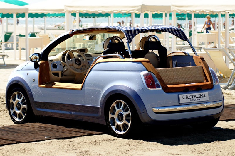 Het is niet de eerste keer dat de Italianen de Fiat 500 omtoveren tot Jolly-achtige. In 2008 onderging de Fiat 500-met-benzinemotoren in handen van Castagna Milano namelijk een vergelijkbare behandeling. Andere opvallende creaties van het bedrijf zijn deze tot shooting brake omgebouwde Fiat 500,deze Audi A8 Avant Allroad en deze weelderig aangeklede Peugeot 2008.