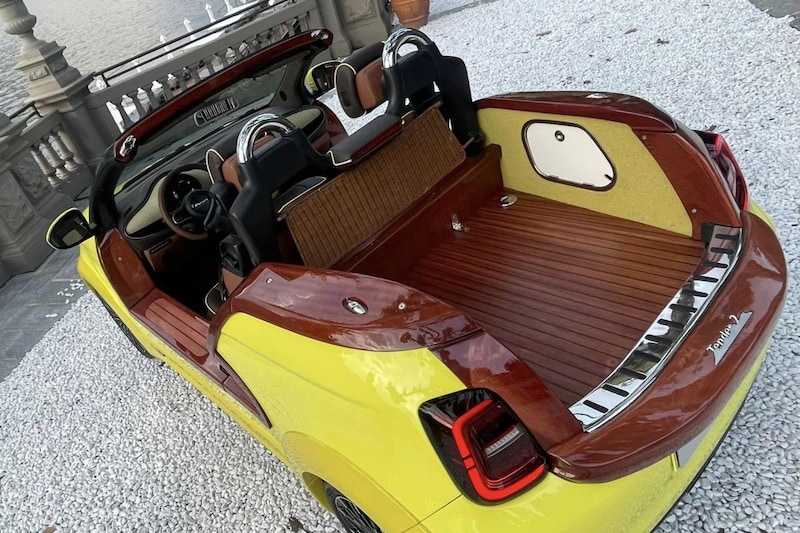 Castagna Milano knipt niet alleen het dak van de Fiat 500e, maar verwijdert ook de B- en C-stijlen van het elektrische Italiaanse kleintje. De tot Tender2 omgebouwde Fiat 500e moet het zelfs zonder achterklep doen en lijkt daarmee niet alleen omgetoverd tot cabriolet, maar ook tot pick-up. Waar je voorheen de kleine bagageruimte en de achterbank vond, tref je nu fraai ogend houtwerk aan dat niet zou misstaan op een stijlvol jacht van Riva. De Tender2 heeft wielkastverbreders gekregen en zowel het meubilair als het dashboard en het stuurwiel is afgewerkt met speciaal beige kunstleer en een interessant geruit stofje.