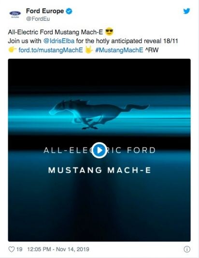 De auto gaat als Mustang Mach-E door het leven. Dat laat Ford in een korte teaser op Twitter weten. Acteur Idris Elba, bekend van de hitserie Luther of de nieuwste Fast & Furious Hobbs and Shaw-film, wordt als ambassadeur naar voren geschoven. Terwijl de acteur in het aankondigingsfilmpje in een duister café koffie drinkt, vertelt hij dat "je niet luid hoeft te zijn om veel lawaai te kunnen maken". Ook zegt hij dat veel geluid uiteindelijk een groot gedeelte van de verrassing verklapt.