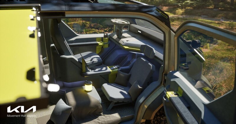Ook de PV5 - Kia's eerste model uit de PBV-serie - ontkomt niet aan een ruige variant. Die opgedirkte PV5 WKNDR is nog fanatieker volgehangen met extraatjes. Net als de EV9 staat hij op offroadbanden en is hij voorzien van afwijkende voor- en achterbumpers. De PV5 WKNDR heeft daarnaast flink uitgebouwde wielkasten om het offroadrubber te kunnen huisvesten en heeft zelfs een hefdak gekregen. Zowel het in- als exterieur is enthousiast bedeeld met groengele details. Opvallend zijn de los te openen achterruit en de twee achterportiertjes. Nog opvallender is het uitschuifbare deel aan de linkerzijde van de bus dat de interieurruimte vergroot.