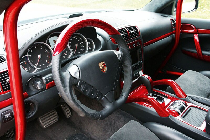 In het interieur zet Enco het supersportieve thema voort. Alle vier de inzittenden kunnen plaatsnemen in kuipstoelen die rechtstreeks uit de 911 GT3 komen. De Duitse tuner slaat zelfs een beetje door en monteert een heuse rolkooi. Rood koolstofvezel op de rolkooi, het stuurwiel, de middenconsole en de deuren overtuigt de laatste twijfelaar dat dit toch echt niet zomaar een Cayenne is.
