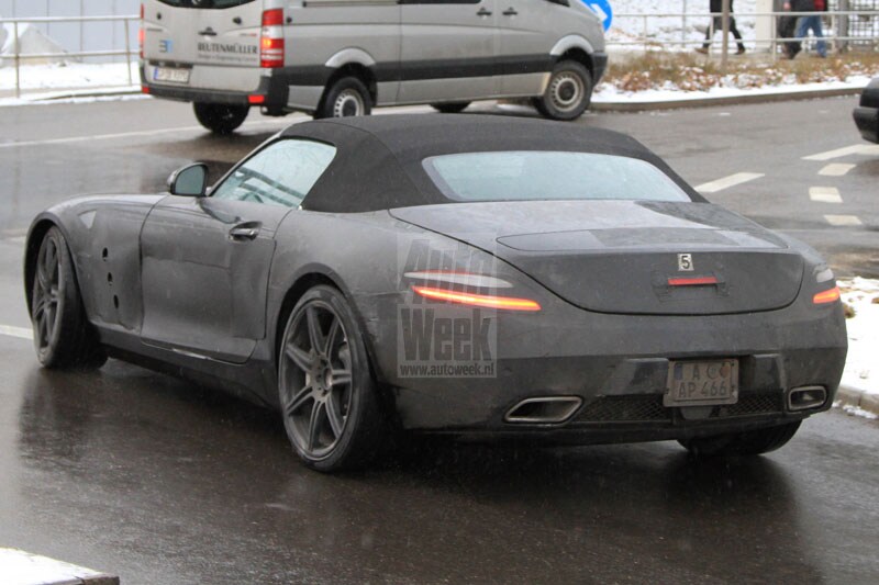 Deze foto's zijn van onze eigen spionagefotograaf. De auto flaneert met de kap dicht op het fabrieksterrein in Stuttgart. Uiteraard krijgt de onthoofde SLS AMG geen vleugeldeuren. Onder de kap zit de 6.3 V8 met 571 pk. De SLS AMG komt na de zomer van 2011 op de markt. Daarna volgt nog een variant van de SLS AMG. Die krijgt de toevoeging Black Series en we verwachten meer vermogen en minder kilo's.