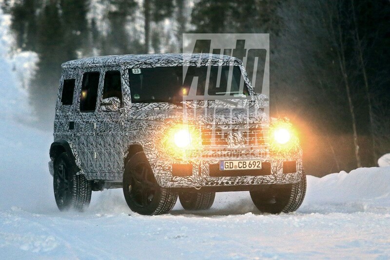 Het is niet de eerste keer dat we de G-klasse in camouflagepak voorbij zien komen. Opnieuw lijkt Mercedes-Benz de nieuwe G-klasse een hoekig voorkomen te geven, dat nagenoeg identiek is aan dat van zijn voorganger. Her en der verwachten we wat designinvloeden van de Ener-G-Force terug te vinden. De nieuweling lijkt vooral in de breedte te groeien. Over breedte gesproken, ook een 63 AMG-versie lijkt hier door de sneeuw te ploeteren, herkenbaar aan zijn uitgeklopte wielkasten.