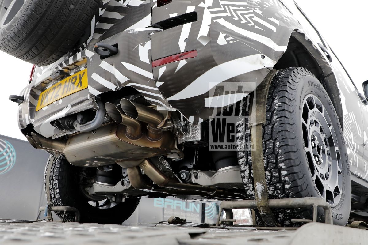 Nu is er ook al een 'reguliere' Defender met V8, maar die auto is gebaseerd op de kortere 90-versie en lijkt nu gezelschap te krijgen van een langere én ruiger uitgedoste variant. De wielkastverbreders die we op eerdere foto's zagen zitten daar niet meer op, maar de dikke terreinbanden zijn nog wel van de partij. Ook zien we dus een ander uitlaatsysteem, met pijpen die recht onder de Defender vandaan steken in plaats van naar beneden gericht zijn. Op de reeds bestaande V8-Defender, met de bekende 5-liter supercharged V8, wijzen de pijpen ook naar beneden, maar die van de nu gespotte testmule dus niet.