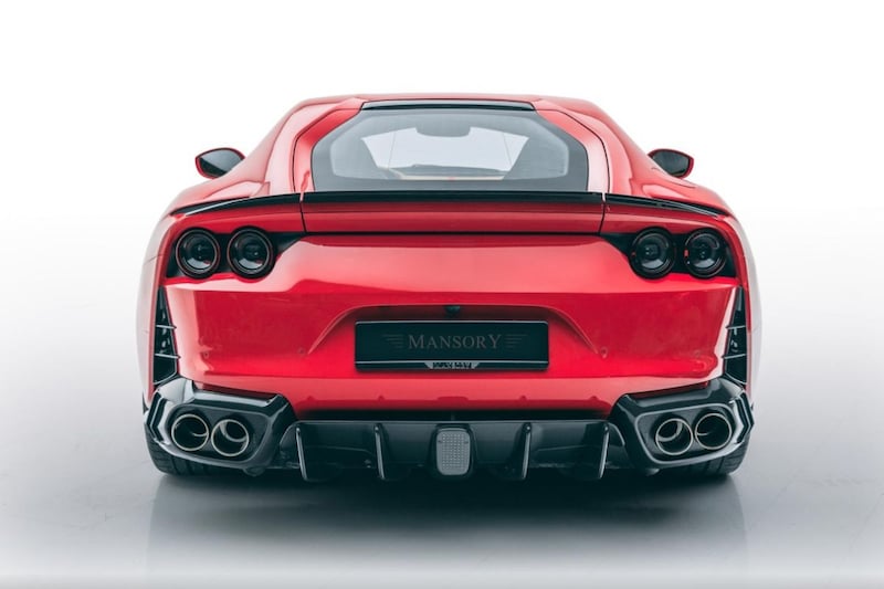 Langs de flanken van de 812 lopen dankzij Mansory nu iets dikkere sideskirts en tenslotte valt aan de achterkant vooral de iets minder subtiele diffuser op. Een koolstofvezel-opzetstuk op de achterspoiler ontbreekt niet. Tenslotte heeft Mansory, zoals gebruikelijk, een eigen setje lichtmetaal onder de auto geschroefd. Mechanische aanpassingen zijn er voor zover bekend niet. De Ferrari 812 Superfast geeft daar met haar 800 pk sterke 6,5-liter V12 ook weinig reden toe.