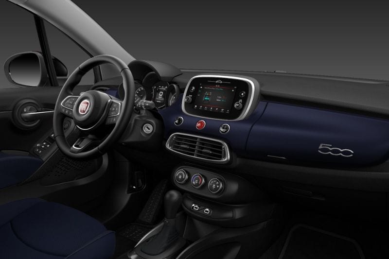 Kijken we binnenin de goedkoopste 500X, dan wordt onze uitspraak over de exotische kleurstelling nog eens extra kracht bijgezet. De 'gratis' bekleding is namelijk, evenals het over het gehele dashboard lopende paneel, blauw! Hierdoor neemt de basis-500X nog iets meer afstand van andere standaarduitvoeringen, want met zijn blauwe stoel-, deur- en dashboardaankleding en wat lichtgrijze accenten is het binnenin de auto verre van sober. Italiaanse flair, zullen we maar zeggen.