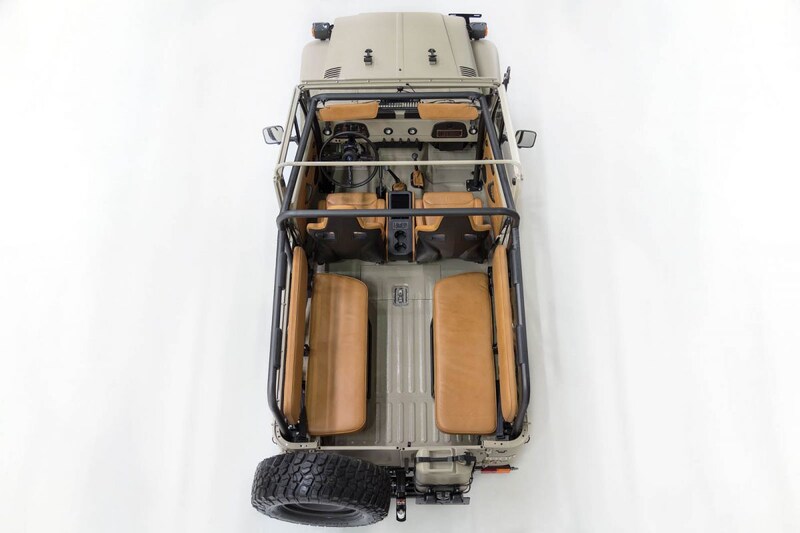 De Land Cruiser van generatie J40 was in een reeks lengtematen te krijgen met elk hun eigen wielbasis. Deze FJ43 begon zijn leven in 1981 als een vrij zeldzame tweedeurs Land Cruiser met de middelgrote wielbasis. Dit in dit geval van een softtop voorziene exemplaar is op technisch vlak volledig gerestaureerd en draagt een geweldig tijdsconforme Dune Beige gespoten koets. FJ Company geeft de auto grotere zijspiegels, een lier, led-mistlampen in de bumper én een moderne 4,0-liter grote V6 met directe inspuiting. Tevens is het onderstel voorzien van Fox-dempers en veren van Old Man Emu. Rondom wordt de remmerij van de huidige 4Runner gemonteerd.