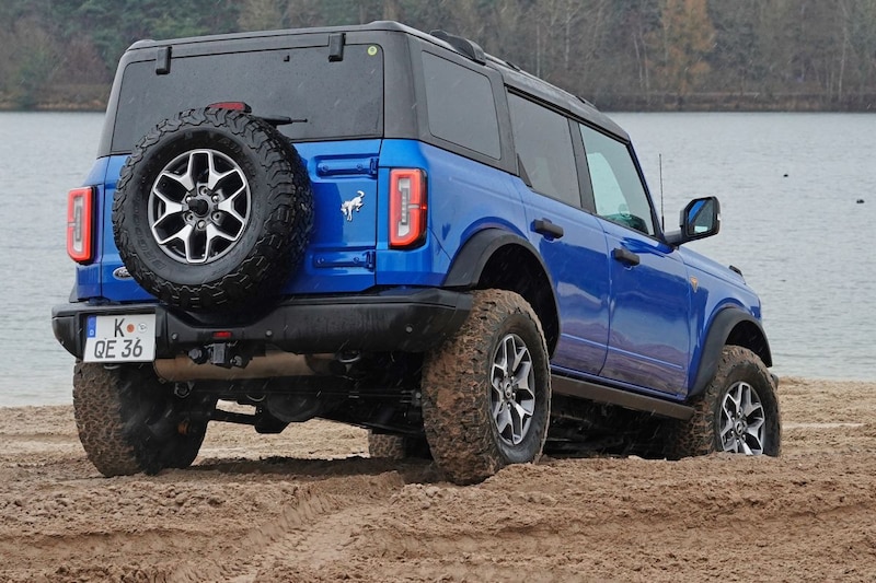 De Ford Bronco Badlands staat op offroadrubber, maar heeft een compleet ander onderstel dan de Outer Banks-uitvoering die zich ook op het asfalt goed moet thuisvoelen. De Badlands heeft bovendien een sperdifferentieel en een systeem dat de stabilisatorstangen aan de voorzijde kan loskoppelen. Dat levert op heftig terrein een enorme wieluitslag op. De tussenbak met hoge en lage gearing kent ook een automatische stand waarmee je tussen twee- en vierwielaandrijving kunt wisselen.