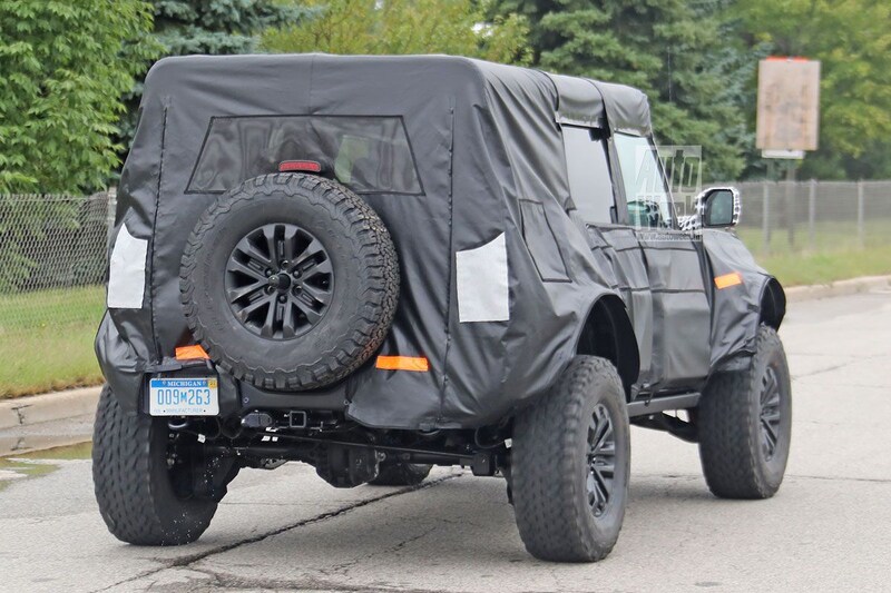 De op deze foto's zichtbare Bronco staat duidelijk fors hoger op zijn poten dan de reguliere versies. Daarnaast is de spoorbreedte aanmerkelijk groter en zijn ook de wielkasten behoorlijk uitgebouwd ten opzichte van die van de Bronco zoals die eerder dit jaar werd gepresenteerd. Om de wielen van het gesnapte testexemplaar zijn All Terrain-banden van BF Goodrich gevouwen. Verdere details zijn nog niet bekend. Reken er overigens niet op dat de Bronco Raptor zich snel aandient, een marktintroductie heeft niet voor 2022 plaats.