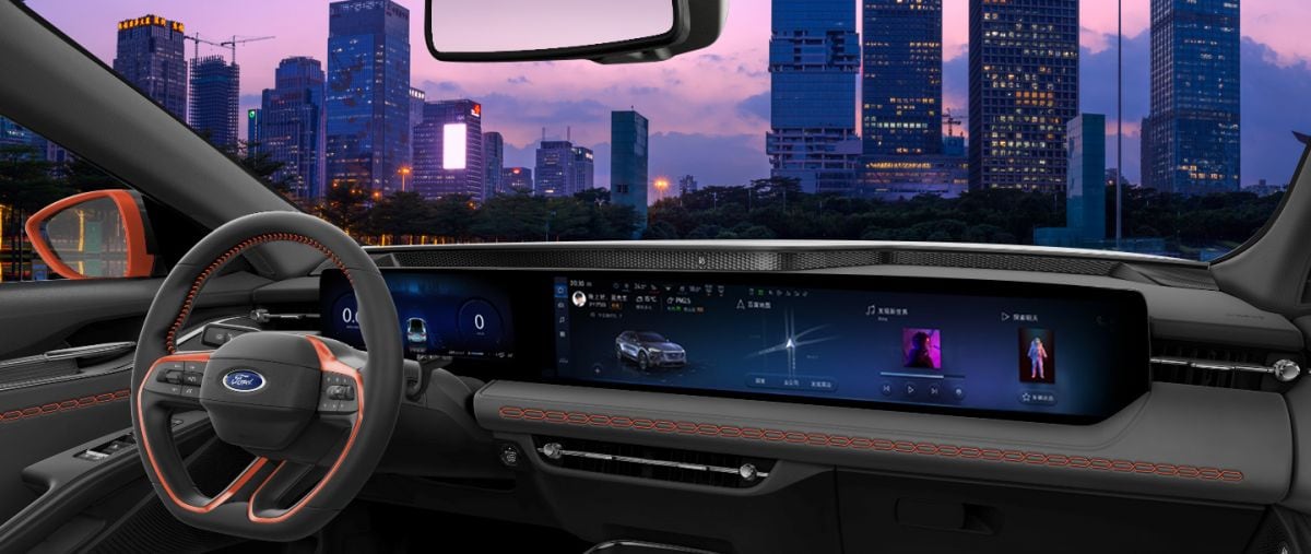De Evos heeft niet alleen een opvallend exterieur, ook van het binnenste heeft Ford werk gemaakt. Het dashboard is namelijk opgebouwd uit een 1,1 meter breed paneel waarin een 12,3 inch metend digitaal instrumentarium en een maar liefst 27 inch breed 4K-touchscreen zijn geplaatst. Dat enorme tweede display fungeert als infotainmentscherm en eindigt vlak voor de neus van de bijrijder. Via OTA-updates (Over the Air) is het systeem actueel te houden. Het infotainmentsysteem draait op software van het Chinese Baidu, compleet met een 'digitale assistent' waar je tegen kunt babbelen. In Europa gaat Ford juist besturingssystemen van Google gebruiken. Technische specificaties van de Evos zijn er nog niet en dus moeten we niet alleen gissen naar de aandrijflijn, maar ook naar de exacte afmetingen van de auto.