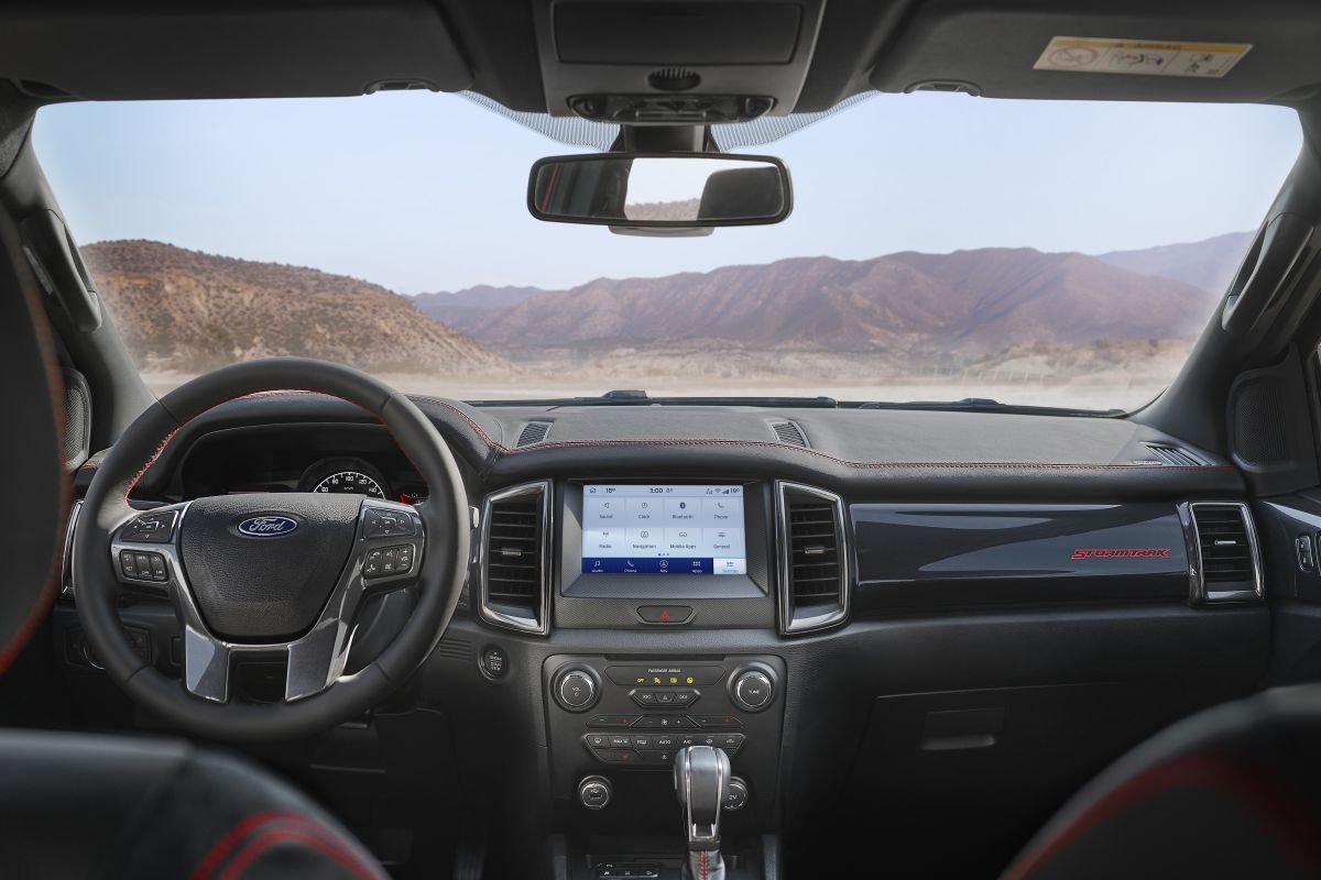 De Stormtrak krijgt verder lederen bekleding waarin Stormtrak-logo's zijn geborduurd. Her en der zien we rode stiksels en Ford kleedt het binnenste verder aan met grijskleurige accenten.