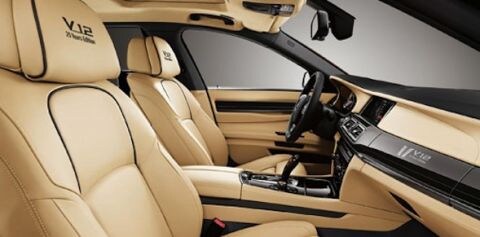 Voor iets minder dan 160.000 dollar – zo'n 20.000 dollar meer dan een 'gewone 760Li – krijgt het jubileummodel onder andere Champagne Full Merino-leer met exclusieve zwarte 'piping', zwarte vloermatten en voetsteunen achterin met champagnekleurige 'piping' en een plafond van alcantara in eerdergenoemde bubbelwijnkleur. Alcantara en zwart leer zijn ook terug te vinden op de dakstijlen en hoedenplank. De panelen op het dashboard zijn afgewerkt met Piano Black Wood en op het dashboard en in de hoofdsteunen zijn V12-logo's te vinden. De achterpassagiers hebben hun eigen entertainmentsysteem dat ze kunnen bedienen met iDrive, waarvan de knop ook voorzien is van V12-logo.
