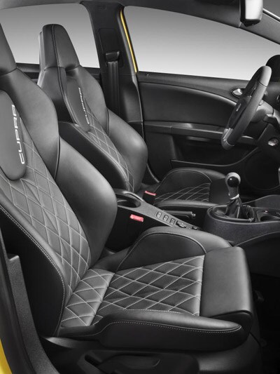 Ook in het interieur domineert het zwart. Zo is er bijvoorbeeld een zwartlederen stuurwiel met aluminiumkleurige accenten en een bijpassende versnellingspookknop. Verder heeft de Cupra witte wijzerplaten en aluminium pedalen. De sportstoelen met het Cupra-logo vergroten het sportieve gevoel verder. XDS, ABS, ESP, een batterij airbags en een bandenspanningcontrolesysteem behoren tot de standaarduitrusting.