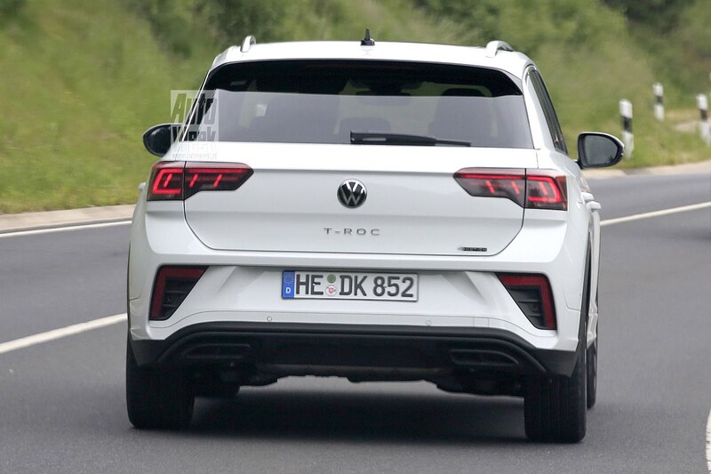 Ook achterop voert Volkswagen kleine wijzigingen door. Zo hebben ook de achterlichten een nieuwe, in dit geval meer gesegmenteerde lichtsignatuur. De T-Roc R-Line lijkt een iets expressiever te worden dan het huidige type. De sportief uitgedoste T-Roc krijgt met zijn nieuwe, met zwarte delen afgewerkte grille meer een eigen gezicht. Onderaan de achterbumper van de R-Line - de witte auto op deze foto's - zien we nieuwe uitlaateindstukken en aan weerszijden van de bumper zitten elementen die de auto meer op de knotsgekke T-Roc R moeten laten lijken. We verwachten dat de T-Roc ook vanbinnen wordt herzien. Of hij net als de Polo een nieuw interieur krijgt, valt nog te bezien. Wel is het aannemelijk dat de infotainment wordt gemoderniseerd. Het is nog niet bekend of de Volkswagen T-Roc Cabrio eveneens wordt gewijzigd, of dat die auto met stille trom vertrekt.