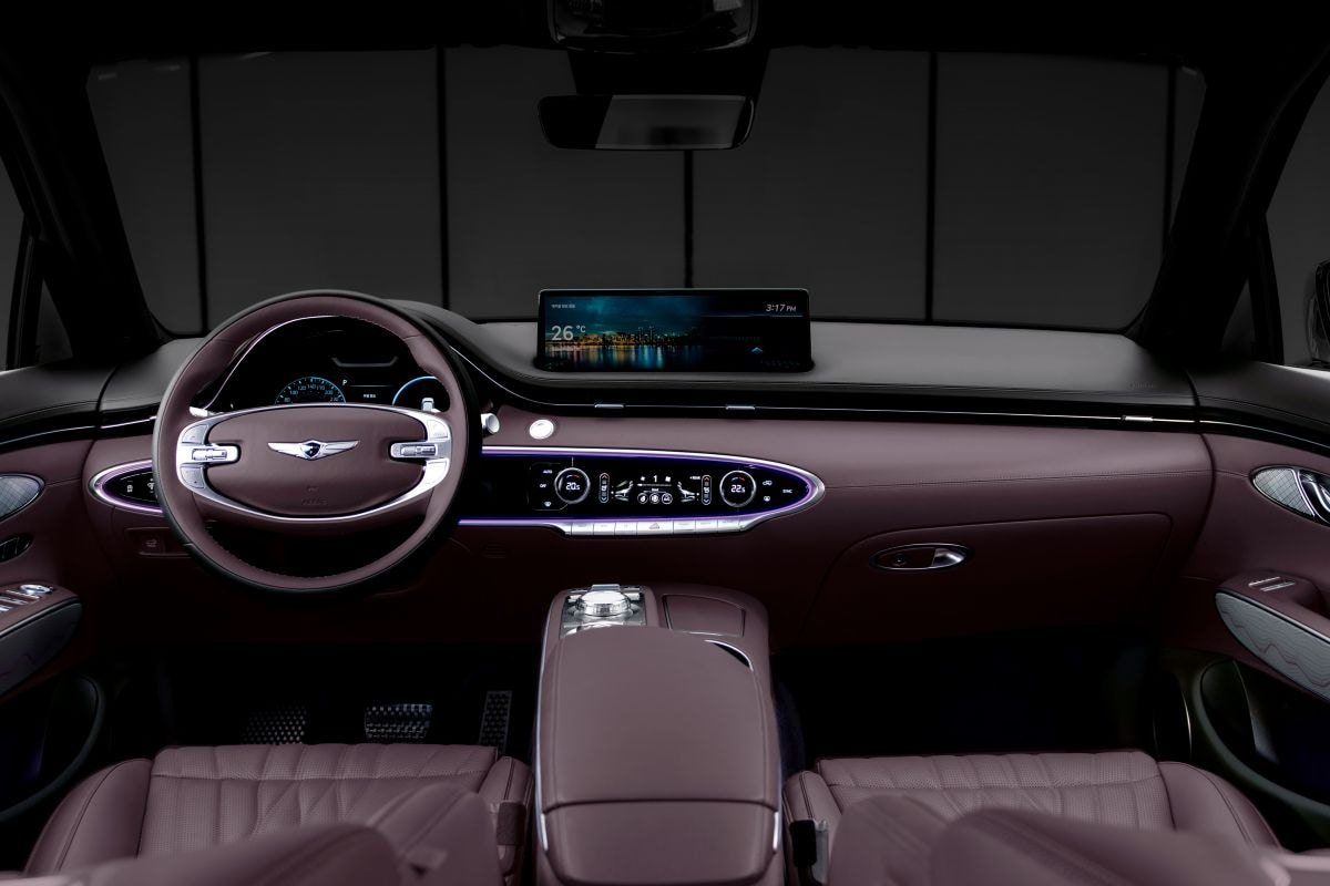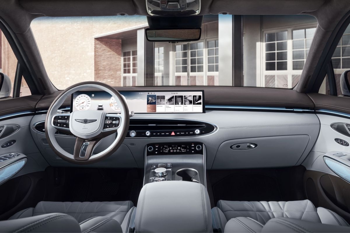 Het echt grote nieuws zit aan de binnenkant. Letterlijk, want het 27-inch-display is fors. De horizontale schermcombinatie betekent dat de bovenkant van het dashboard er heel anders uitziet dan voorheen, toen het infotainmentscherm en het instrumentarium nog twee losse onderdelen waren. De draaiknop om de boel mee te bedienen lijkt de facelift te overleven, dus anders dan Audi en BMW levert Genesis zijn klanten niet volledig over aan de grillen van het alsnog aanwezige touchscreen.