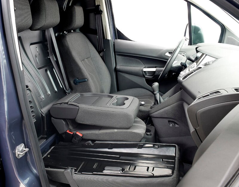 De nieuwe Transit Connect maakt net als de vorig jaar geïntroduceerde Transit Custom vooral indruk met zijn rij-eigenschappen en comfort. Verder zien we dezelfde aandacht voor praktische details, zoals de opvallend bolle vorm van de tussenwand. Aan cabine-zijde levert dit extra ruimte voor de bestuurder op, terwijl de vorm in de laadruimte garandeert dat er platen van 240x120 cm in passen. De keerzijde is het gebolde raampje in die wand, die van de binnenspiegel een heuse lachspiegel maakt - in de verkeerde zin van het woord. Gelukkig zijn er grote, dubbele buitenspiegels. Echt op de lachspieren werkt de smalle, extra zitplaats tussen de voorstoelen. Voor noodgevallen, zegt Ford, terwijl er alleen mensen zonder benen kunnen zitten. Beter is het om de leuning neer te klappen, waarna er een handig tafeltje verschijnt. De passagiersstoel biedt helaas bar weinig zitcomfort; het is een concessie voor de in- en opklap-mogelijkheden die het complexe stoelframe biedt. De laadruimte is 2,9 of 3,6 kuub groot, (was 2,8 en 3,7 m3) terwijl het laadvermogen bijna 1.000 kg bedraagt (was max. 930 kg). Een Europallet past nipt door de schuifdeur, terwijl er twee achter elkaar in de laadruimte passen - ook in de Connect met korte wielbasis. De Ford Transit Connect arriveert in januari bij de dealers.