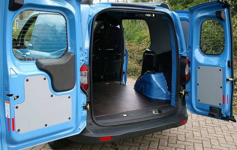 Het zij-aanzicht van de Transit Courier maakt duidelijk dat de neus en het zitgedeelte samen meer autolengte voor zich opeisen dan de laadruimte. Maar goed, wie voldoende heeft aan 1.620x1.488x1.227 mm aan laadruimte (Ford noemt een volume van 2,3 kuub) zal met deze kleine Ford prima uit de voeten kunnen. De laadruimte is via twee achterdeuren van ongelijke breedte (tot 180 graden te openen) bereikbaar. De schuifdeur rechts (standaard op de Trend) geeft een opening vrij van slechts 45 cm breed, waarmee de bruikbaarheid niet voor iedereen even groot zal zijn.