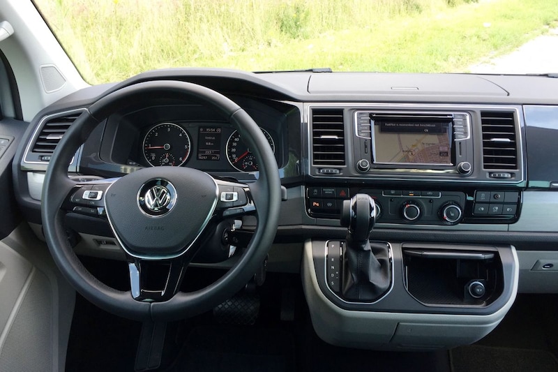 Comfort schrijft deze Volkswagen met hoofdletters. Het erg soepele veerkarakter zal echter niet ieders smaak zijn. De demping moet steviger, want de auto deint nu voortdurend heel licht als de weg niet biljartlaken-strak is. Je gaat onwillekeurig zoeken naar een sportknop om de boel wat straffer te zetten. Maar toch: mede dankzij de verlengde wielbasis van deze L2-versie schrijdt de T6 even onverstoorbaar als een klassieke Citroën over lange oneffenheden. Dwarsrichels en ander klein ongerief werkt hij nauwelijks hoor- en voelbaar weg. Sowieso is de stilte aan boord een vermelding waard, want pas boven 130 km/h laat de tweeliter viercilinder van zich horen. Erg jammer is daarom de storende resonantie bij 1.800 toeren, overeenkomend met 105 km/h in de 7e versnelling. Remedie: de DSG dan even in 6 zetten, dat maakt voor het verbruik amper uit. Het testgemiddelde kwam uit op 8,1 l/100 km. Best netjes, gezien de 2,2 ton die de auto leeg weegt en de uitdagende specificaties van de motor. Het is de snelste diesel en dat voel je goed: de acceleratiekracht is aldoor verrassend groot. De DSG moet je voor een tussensprint wel nadrukkelijk in stelling brengen, anders denkt hij eerst lang na voor hij tot actie overgaat. De S-stand kun je vergeten, die maakt het rijden onrustig zonder dat daar iets tegenover staat. En de dubbele cabine? Zeer ruim en comfortabel voor vijf personen en met een gemakkelijke instap achterin dankzij de elektrische bedienbare schuifdeuren (€ 1.330). De laadruimte is nog steeds groot: achter de immense, zwaar te sluiten achterklep past nog altijd 4,5 kuub. En da's nog meer dan een Caddy Maxi te bieden heeft.