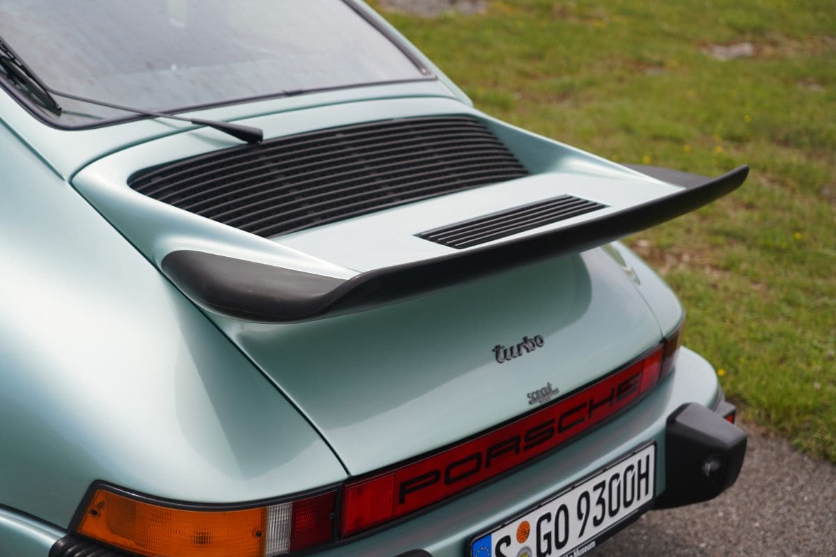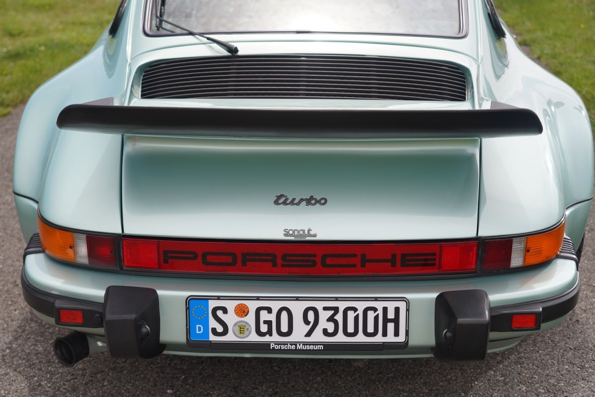 Van de houten bank zijn we naar de Silbergrün Diamant Metallic gespoten 911 Turbo gelopen. Het betreft een model uit het eerste productiejaar 1974, met de oude buitenspiegel (één exemplaar, in de carrosseriekleur voor de Turbo), de ontbrekende, kenmerkende zwarte steenslagbescherming voor de achterspatborden (die later van 3M-materiaal was) en de oorspronkelijke achterspoiler. Burst legt uit: “In de eerste jaren maakten we gebruik van deze vorm. Met de komst van de intercooler hebben we een nieuwe, elegantere spoiler ontworpen met grotere koelsleuven waarin de intercooler kon worden opgenomen. Vanaf 1977, toen het slagvolume van 3,0 naar 3,3 liter ging en het vermogen steeg tot 300 pk, kreeg de 911 Turbo deze nieuwe spoiler. De voorspoiler was echter vanaf het begin al perfect, dus die bleef zoals hij was. Het samenspel tussen de voor- en achterspoiler was vanaf het begin in orde.”