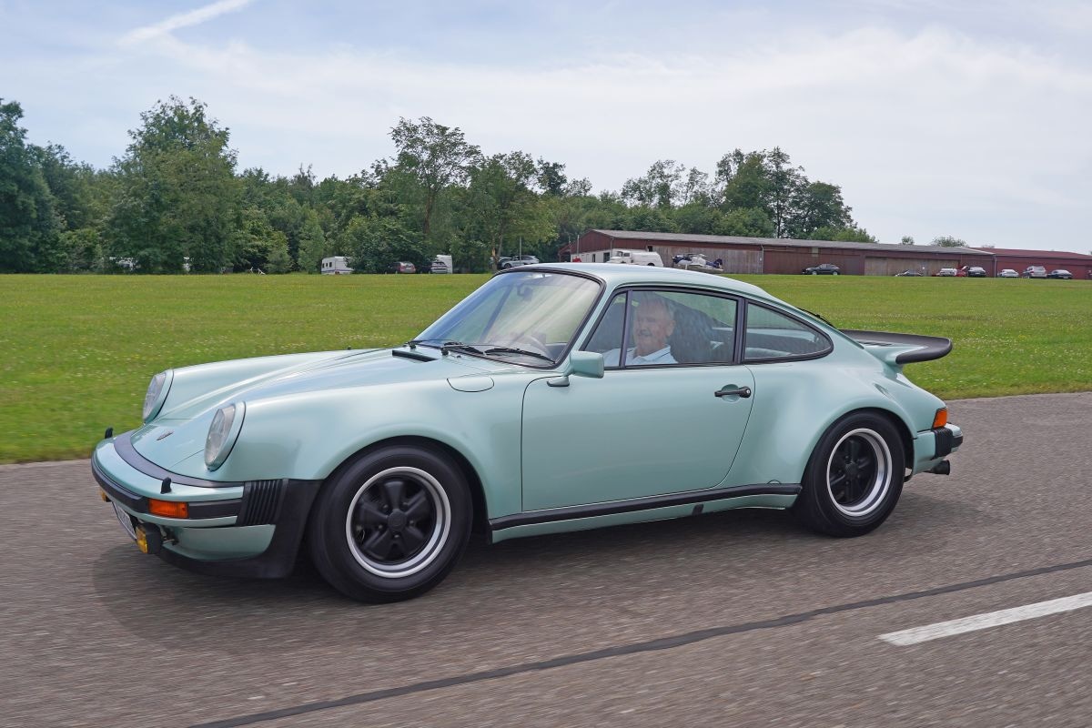 Burst laat de komische manier van warmteregeling zien terwijl we een rondje over de start- en landingsbaan rijden met de eerste generatie 930 Turbo, de interne naam voor de 911 Turbo. Hij wijst ook op de talrijke onzichtbare detailverbeteringen, die vooral merkbaar zijn als je de verschillende generaties naast elkaar vergelijkt. “Ik ben het meest trots op de verbeterde aerodynamica en de primeur met de verzinkte carrosserie, waardoor we twaalf jaar carrosseriegarantie konden geven.” Burst demonstreert de grip van de 911 Turbo door de turbo op te wekken. “Het turbogat is goed voelbaar, maar zodra de turbo op stoom is, maakt hij enorme stappen.”