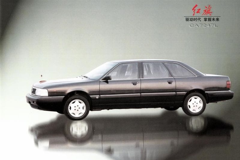 Maar als in 1991 deze Audi in Duitsland uit productie gaat, is dat nog geenszins het einde van het model. Een paar jaar later duikt er namelijk een vrijwel identieke auto op in China. Dezelfde gestroomlijnde carrosserie, hetzelfde ruime interieur. Onder de motorkap zit echter geen roffelende vijfcilinder, maar een vierpitter van Chrysler of een V6 van Nissan. De motorkap wordt gesierd (?) door een rood ornament dat nog het meeste weg heeft van een hanenkam. En waar is het trotse logo met de vier ringen gebleven? Nee, dit is geen Audi 100 meer. Dit is de Hongqi CA7220. En hij is gebouwd door Volkswagen in samenwerking met de Chinese producent FAW. Hongqi, inderdaad, het merk dat we nu zelfs in Nederland kennen, van de E-HS9.