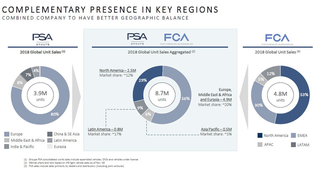 Hoewel het straatbeeld in Europa anders doet vermoeden, is FCA op dit moment met afstand de grootste van de twee. De Amerikanen en Italianen verkopen samen jaarlijks zo’n 4,8 miljoen voertuigen, tegen 3,9 miljoen voor PSA. Het verschil is dat maar liefst 80 procent van de PSA-producten in Europa op de weg verschijnt, terwijl meer dan de helft van de FCA-auto’s in Noord-Amerika wordt verkocht.