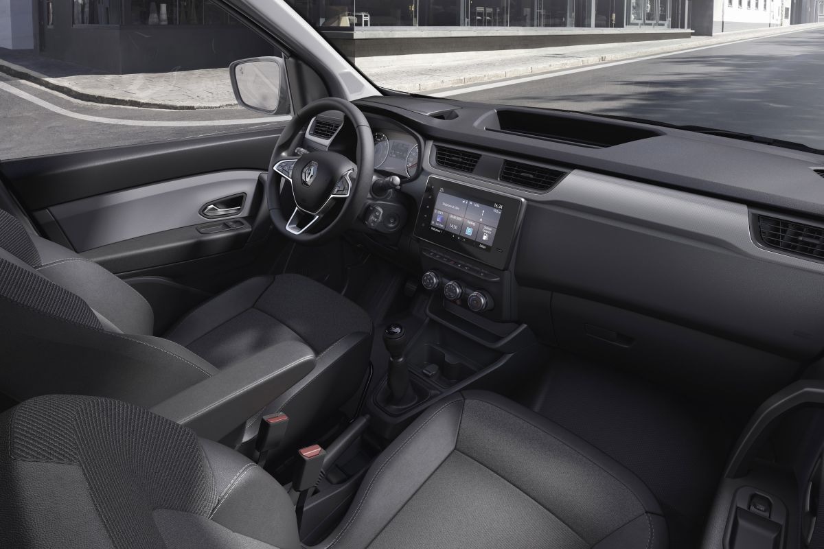 Het interieur is relatief eenvoudig van opzet, maar niet ouderwets. Renault spreekt over 'robuuste stoffen bekleding' op de stoelen, die overigens afwijken van de zetels in de Dokker. De bestuurdersstoel is gewoon in hoogte verstelbaar. Renault zegt verder onder meer de akoestiek en isolatie te hebben verbeterd. De Express-werkplek heeft dankzij een hele verzameling vakjes, bakjes, gleufjes en nisjes 48 liter aan aflegruimte. Renault levert onder meer de Connect R&Go-radio in de Express, al is ook een uitgebreider Easy Link-systeem met 8-inch touchscreen leverbaar. Het Easy Link-systeem kan onder meer met Android Auto en Apple CarPlay overweg en heeft een navigatiefunctie. Aan aansluitmogelijkheden overigens geen gebrek. De Express heeft drie usb-poorten en vier 12v-aansluitingen waarvan er zich één in de laadruimte bevindt. Optioneel levert Renault zelfs een inductielader.