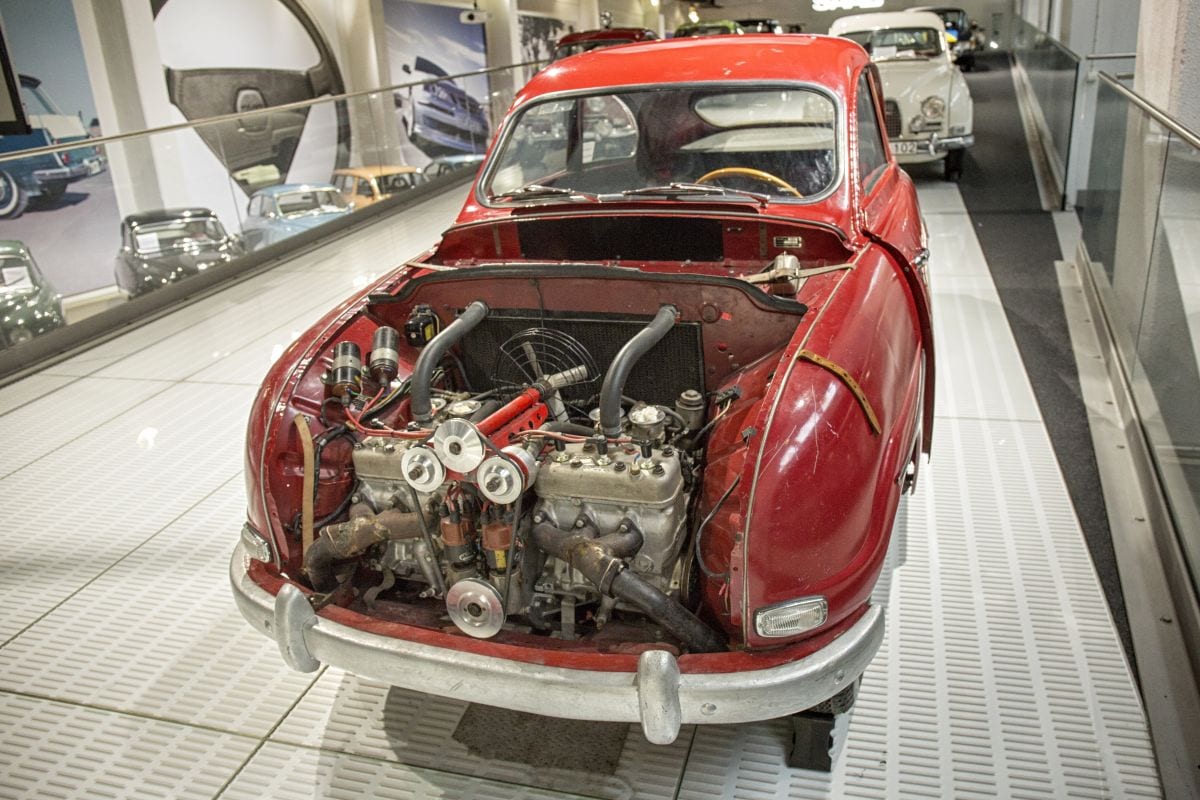 Bij Saab waren ze altijd wel in voor een experimentje, zoals deze ‘Monster’ uit 1959 met zijn twee driecilinder tweetaktmotoren dwarsgeplaatst voorin. Samen goed voor 140 pk en een topsnelheid van 196 km/h. De reglementen bepaalden dat dit soort constructies niet is toegestaan, waardoor dit monster nooit in wedstrijdverband heeft gereden.