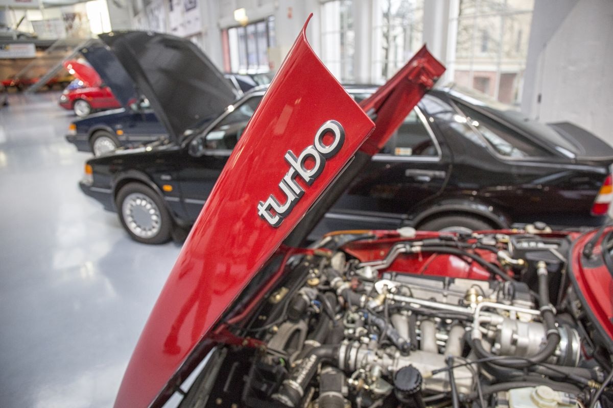 Saab was pionier op turbogebied, waarbij de in 2016 overleden ingenieur Per Gillbrand (‘Mr. Turbo’) in Trollhättan als halfgod wordt gezien. De 99 was in 1978 de eerste Saab met turbomotor. Zijn 2,0-liter viercilinder leverde dankzij de extra drukvulling 145 pk, wat hem serieus snel maakte voor die tijd. Fraai detail zijn de lichtmetalen ‘Inca’ wielen, een grafische voorstelling van turbineschoepen. Voor meer 99 Turbo moet je hier kijken, want we kregen bij ons bezoek aan het museum een exemplaar van de museumcollectie mee.