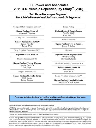 Het gemiddelde aantal problemen dat JD Power registreerde was 151 per 100 auto's. Dat is precies de score van Infiniti en Smart scoort net één probleem meer. Toyota is in zeven segmenten de meest betrouwbare keuze. Opvallend is verder dat Volkswagen het niet zo heel best heeft gedaan, slechts vijf merken bleken onbetrouwbaarder.
