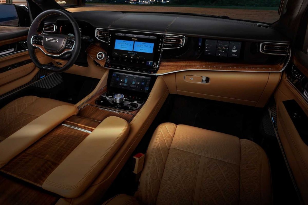 Wat voor het exterieur geldt, gaat ook op voor het binnenste van de Wagoneers. Dat lijkt namelijk ook als twee druppels water op dat van de Grand Wagoneer Concept. De Wagoneer heeft standaard een 10,3 inch digitaal instrumentarium, de Grand Wagoneer krijgt een groter 12,3 inch metend exemplaar. Daarbij heeft de Wagoneer alleen een 10,1 inch infotainmentsysteem terwijl de Grand Wagoneer het 12 inch exemplaar krijgt. Die Grand Wagoneer heeft daaronder, net als de Grand Wagoneer Concept, een 10,3 inch scherm waarmee onder meer de klimaatregeling wordt bediend. Ook is de Grand Wagoneer met een derde display te krijgen dat, inderdaad, net als bij de concept-car direct voor de bijrijder in het dashboard is geplaatst. Het binnenste van de Grand Wagoneer is verder met fraaier ogende materialen af te werken.