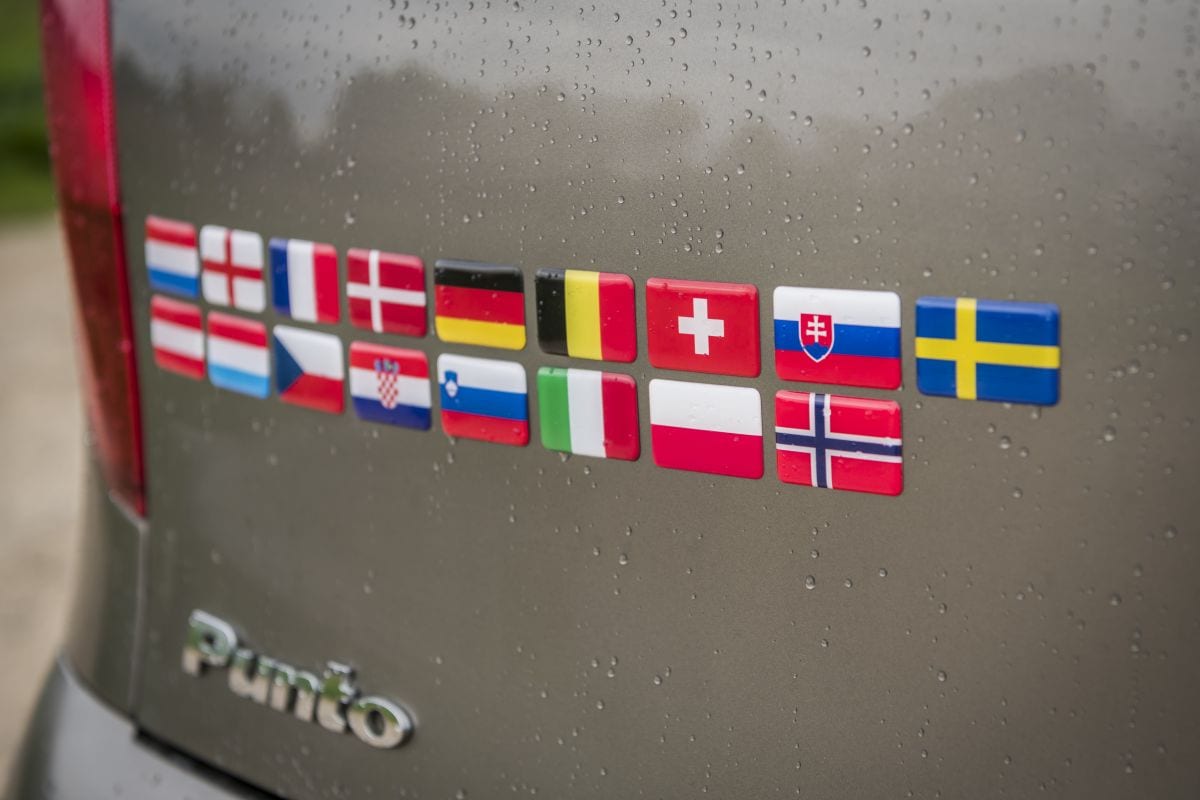 Alle landen die de Punto onder zijn wielen heeft gehad, worden door Joost geëerd met een vlagsticker. Vooral de laatste vijf jaar groeit de verzameling hard: Oostenrijk (2017), Groot-Brittannië (2018) en een rondreis door