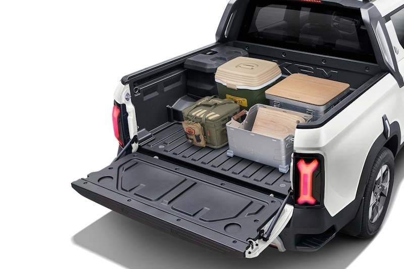 Het interieur van de KGM Musso EV ken je van de Torres EVX. Het biedt onder meer een 12,3 inch groot display achter het stuurwiel én een infotainmentscherm met eenzelfde diagonaal. De stoelen op de tweede zitrij zijn volgens KGM verschuifbaar en 'gezellig kantelbaar'. Dat is ook wat waard. KGM heeft onder meer een pakket samengesteld dat een koelbox en dwarsdragers voor op het dak naar de pick-up brengt. Ook is er een pakket bedacht dat een oprolbare afdekking en verdelers voor in de laadbak naar de auto brengt. Ten slot zijn er ook diverse 'stellages/imperiaals' voor de laadbak mogelijk.