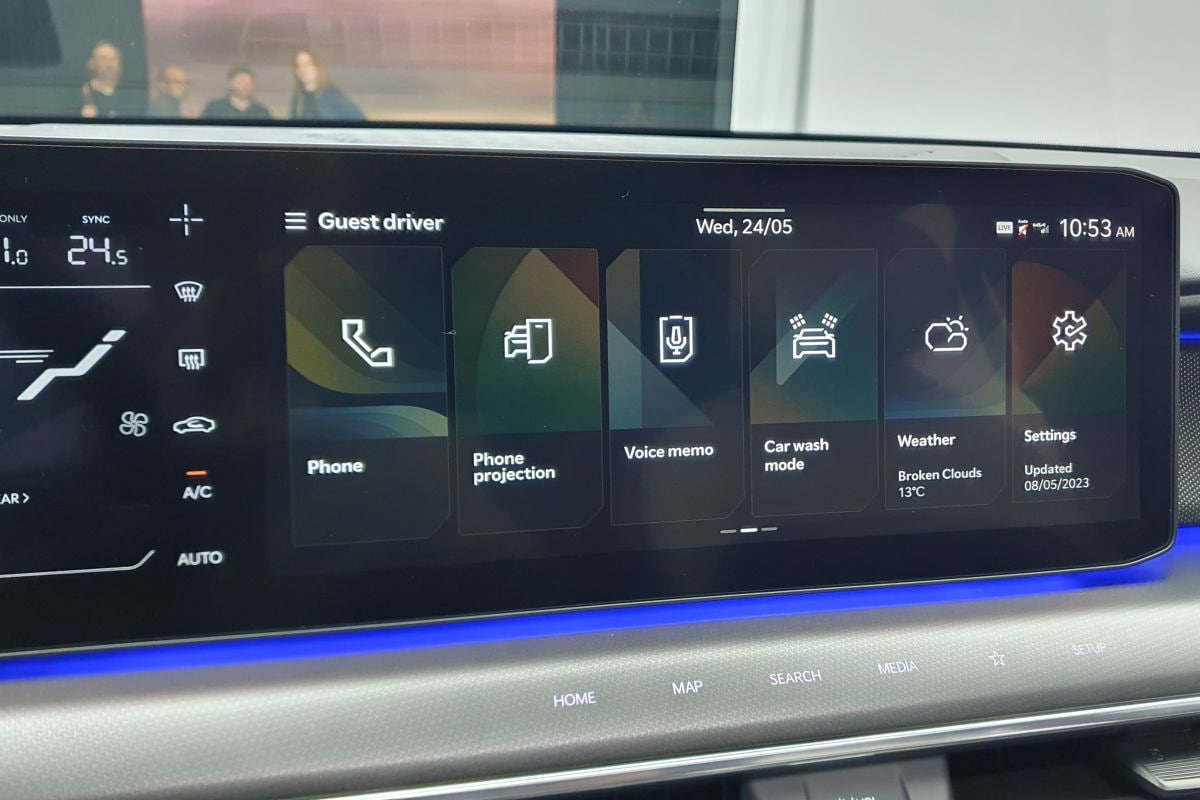 Voor in de Kia EV9 is een drietal schermen te vinden dat Kia het ‘Triple Panorama Display’ noemt. Het bestaat uit een 12,3-inch informatiedisplay achter het stuurwiel, een 12,3-inch touchscreen én een 5,1-inch schermpje dat is toegespitst op de climatecontrol. Dat middelste scherm is met zijn wekkerradio-achtige lettertjes heel wat eenvoudiger dan de anderen, maar biedt mooi wel direct toegang tot functies die nu eenmaal vaak toegang behoeven.