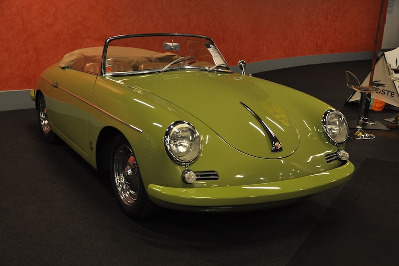 Ook de Porsche 356 cabriolet die we aan de overzijde van het gangpad vonden valt op door z'n groene kleur, al is het natuurlijk ook zonder dat een zeer begerenswaardige auto. Van een heel andere orde, maar toch ook erg bijzonder, is de Fiat 500 Jolly. De Jolly is een op de langere Giardiniera gebaseerd cabriootje zonder deuren, die zich bovendien weet te onderscheiden door z'n rieten stoeltjes en bijzondere dakje. Dit exemplaar is getuige de grote, hoog gepositioneerde koplampen afkomstig uit Amerika.