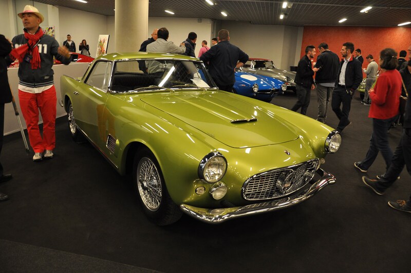 Even verderop was een totaal andere kijk op Italiaanse schoonheid te vinden: deze Alfa Romeo Giulietta SS viel niet alleen op door z'n weelderige vormen, maar ook door z'n zeer bijzondere, hardblauwe kleur. Het coupeetje stond gezellig tussen twee leeftijdsgenoten met een minstens zo markante kleurstelling: een zilvergrijze E-type roadster met rode kap en een Maserati 3500, uitgevoerd in een unieke heldergroene tint.
