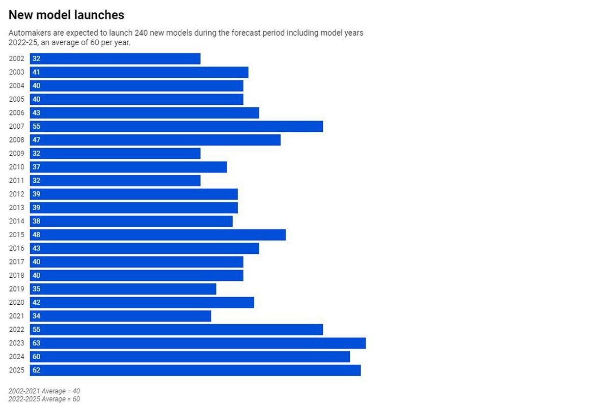 De studie, die wordt aangehaald door Automotive News, voorspelt dat er in de periode 2022-2025 in totaal 240 nieuwe modellen worden gelanceerd. Dat komt neer op gemiddeld 60 stuks per jaar, veel meer dan in de periode die achter ons ligt. De laatste 20 jaar lag het gemiddelde op 40 per jaar, waarbij er in de meest recente jaren zeker niet meer nieuws is gelanceerd dan in de jaren die verder achter ons liggen.