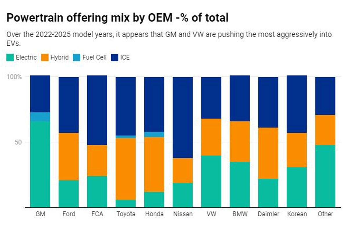 Wel zijn de kaarten anders geschud als het gaat om elektrificatie. Zo lanceert GM, dat in Europa na de overname van Opel nog nauwelijks bestaat, de komende jaren bijna alleen maar elektrische modellen. Bij andere merken spelen hybrides en auto’s met een verbrandingsmotor nog een grotere rol, al is wel duidelijk dat de EV als ‘the way to go’ wordt gezien.