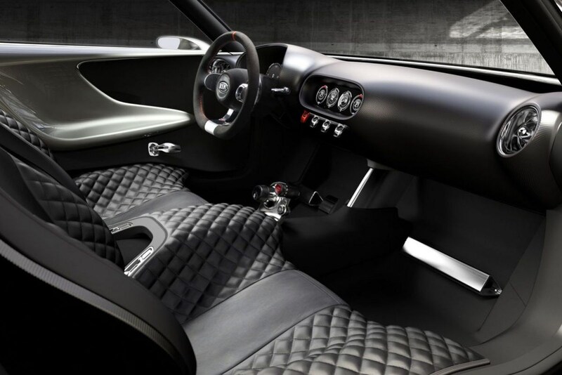 Het interieur is redelijk retro met zo weinig mogelijk knoppen en een honingraatmotief voor de lederen bekleding. De meters zijn digitaal en het stuurwiel is bekleed met alcantara.