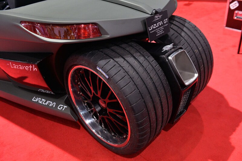 Lazareth zegt zelf dat de Wazuma GT geen auto en geen motorfiets is. Daar lijken ze een punt te hebben; in eerste instantie lijkt de speedboot-op-wielen een driewieler. Toch komen we aan de achterzijde 'gewoon' twee wielen tegen, al zijn ze wel erg centraal geplaatst.