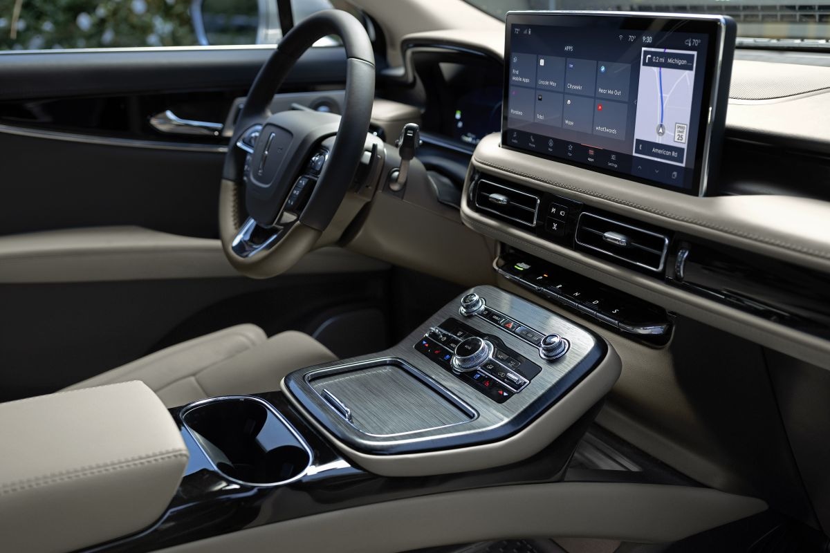 Die heeft op het eerste gezicht niet al te veel om het lijf. Lincoln past de voorbumper aan en daar hebben we de uiterlijke aanpassingen mee gehad. Wat er wél is aangepast, speelt zich onder het plaatwerk van de Nautilus af. De SUV krijgt namelijk een compleet nieuw interieur. Op het stuurwiel, de deurpanelen en de middentunnel na is werkelijk alles aangepast. Het ietwat bedaagd ogende dashboard van voorheen maakt plaats voor een cockpit die we kennen van de overige modellen van het merk: de Navigator, Corsair en Aviator. Ook hier voortaan een zwevend 13,2-inch display met een uitgekleed en geknikt knoppeneiland dat de middentunnel en het dashboard met elkaar verbindt. Achter het stuurwiel zit een nieuw digitaal instrumentarium. Nagenoeg alles is verder gewijzigd, van de ventilatieroosters tot de bedieningselementen voor de klimaatregeling.