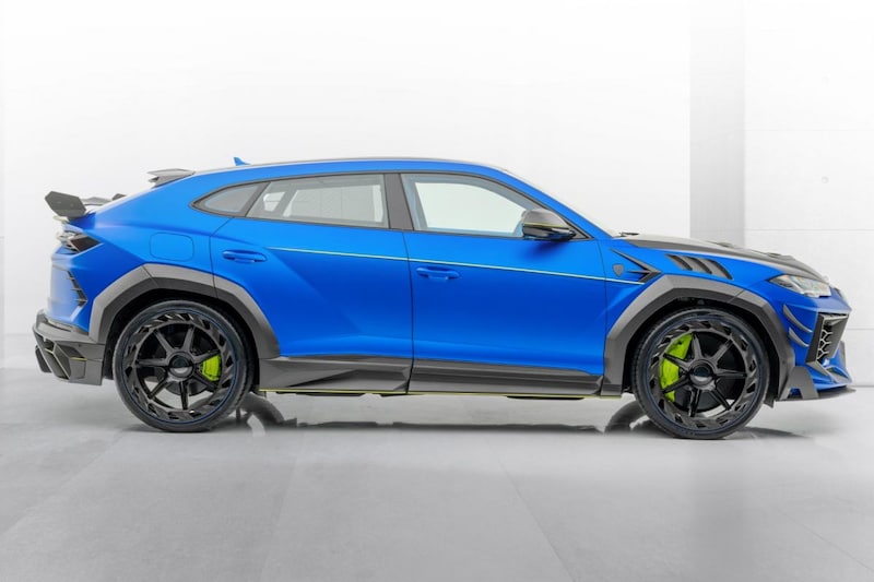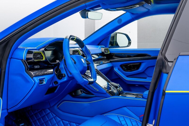 De Wide Body-behandeling van Mansory levert een heel scala aan nieuwigheden op de Urus op. Zo valt rondom het dikkere spoilerwerk op, is de koets op bijna alle panelen voorzien van extra luchthappers en prijkt er een enorme diffuser aan de achterzijde. Al het door Mansory aangebrachte spul steekt donker af tegen de blauwe basis. Ook de spectaculair vormgegeven zwarte 20-inch wielen zijn niet te missen. In het interieur is een zonnebril misschien geen overbodige luxe, want daar springt knalblauw leer je tegemoet. Ook hier keren de neongroene accenten terug. Helemaal bijzonder zijn de lichtgevende patronen in het dak.